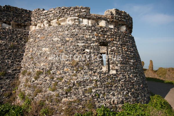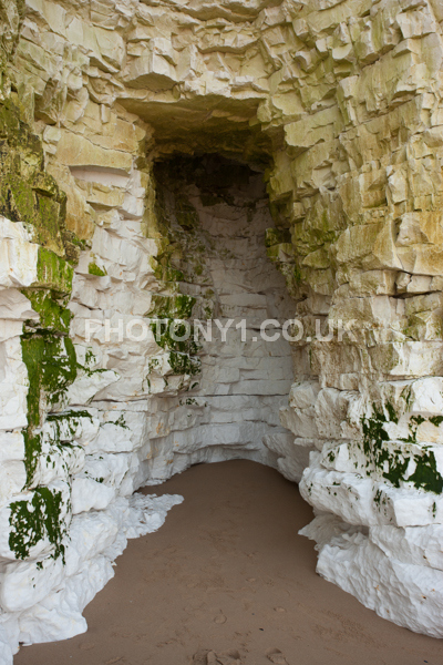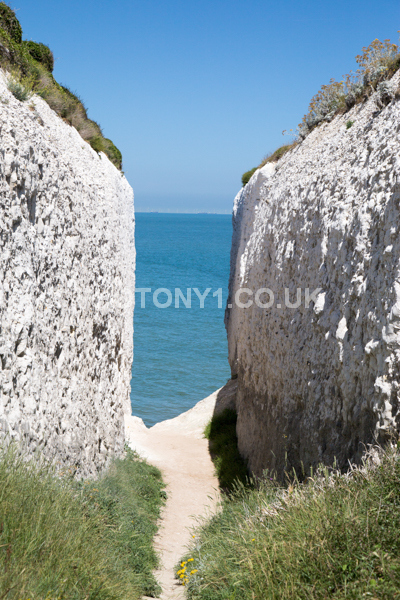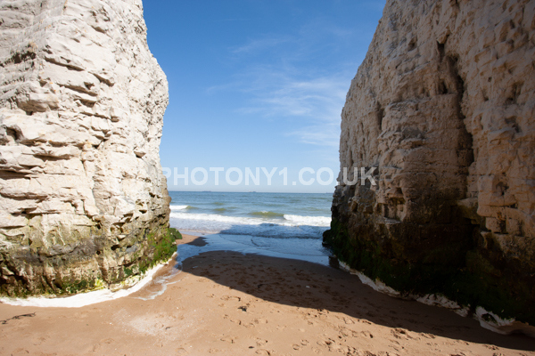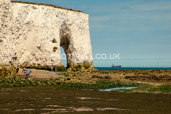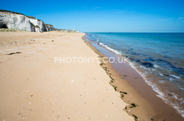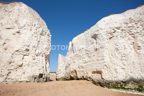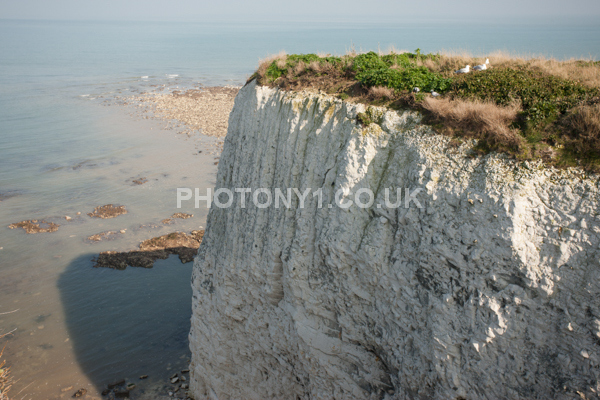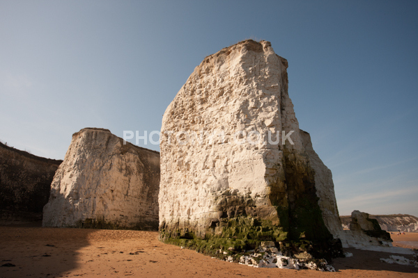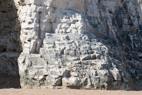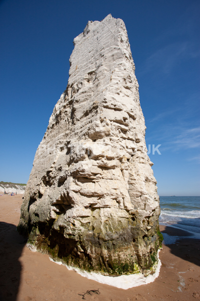 Chalk Cliffs, sandy beach, rocks and sea, with sunshine, shadows and reflections. Neptunes Tower a historic monument.