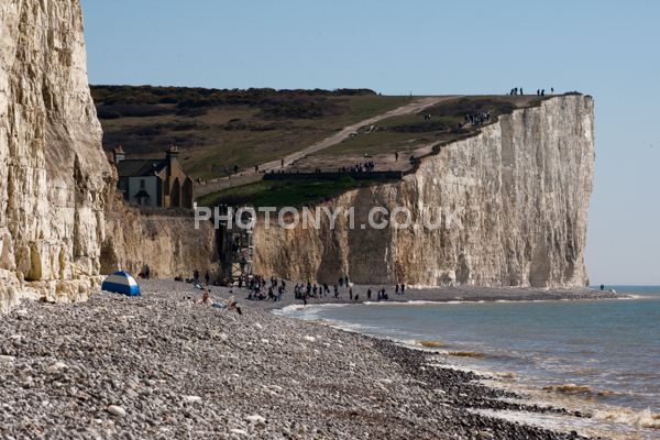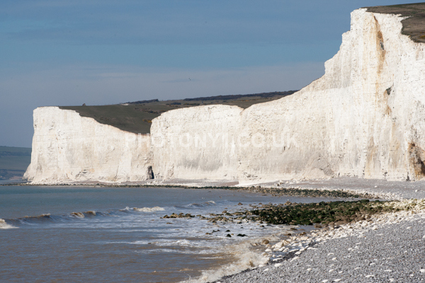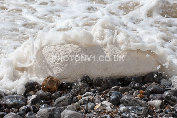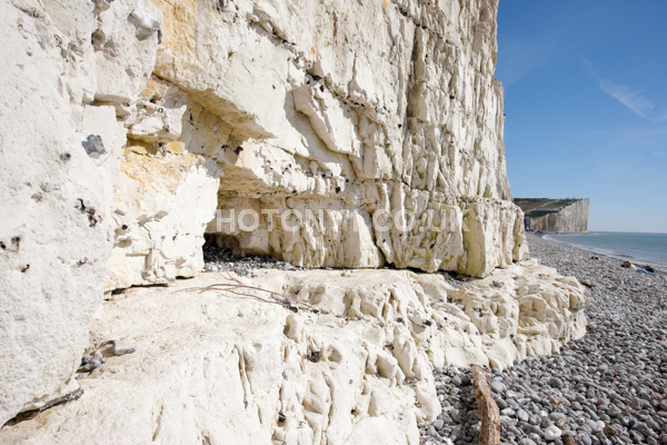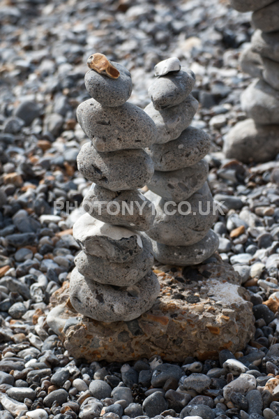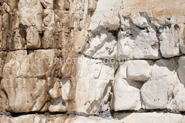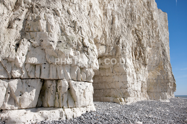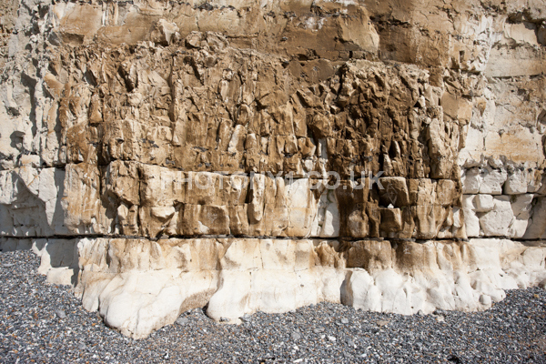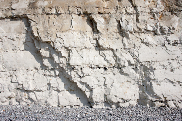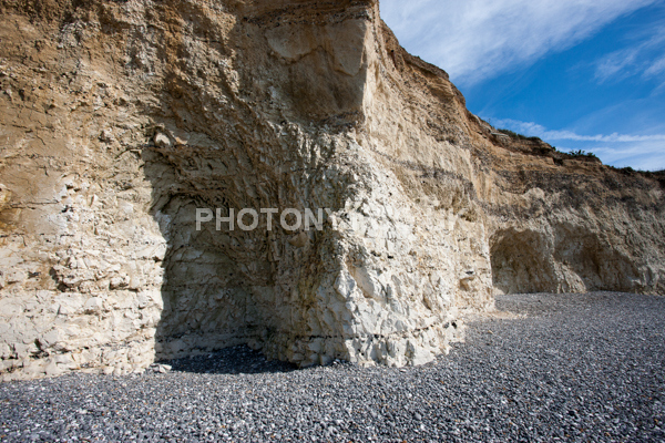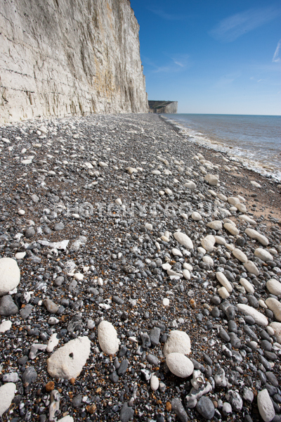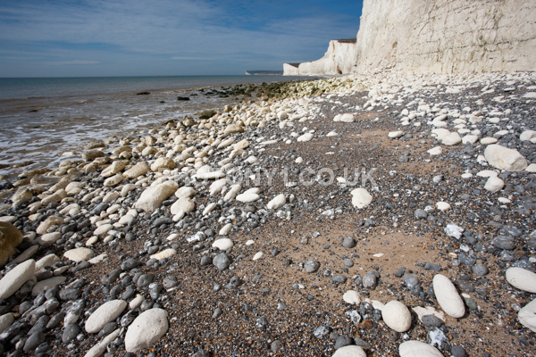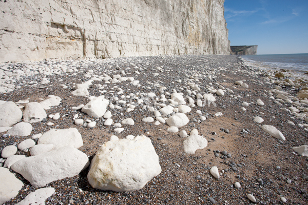 Chalk Cliffs, sandy beach, rocks and sea, with sunshine, shadows and reflections. Pebble piles, art on the beach.