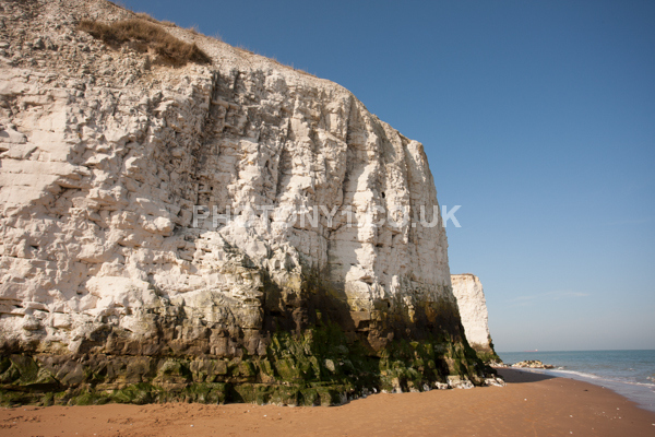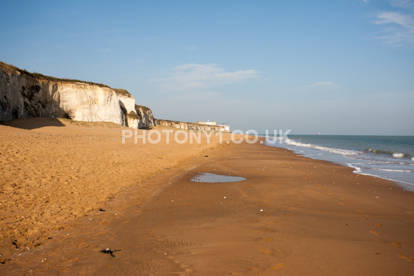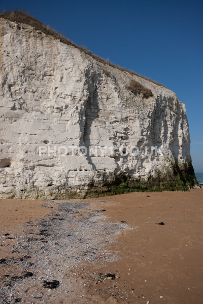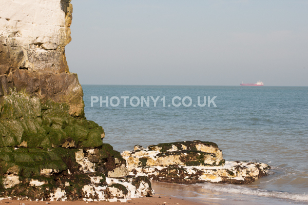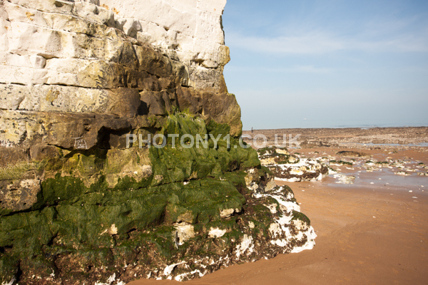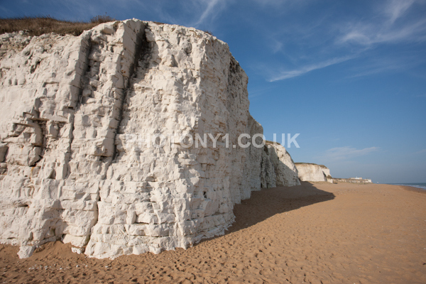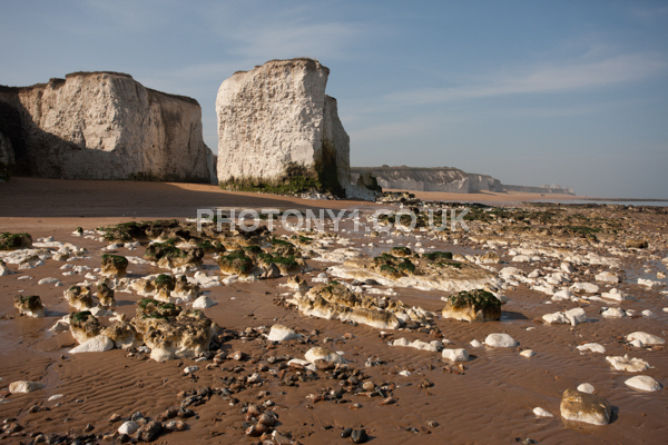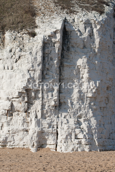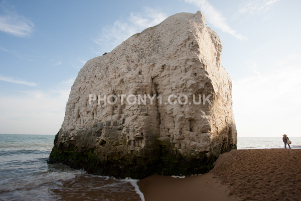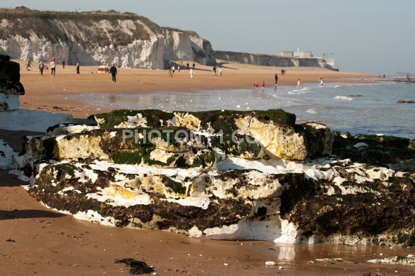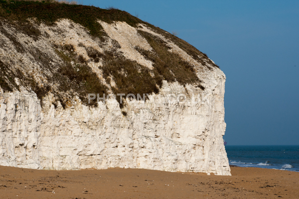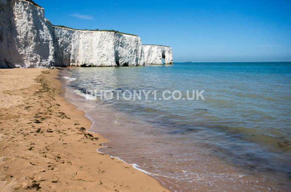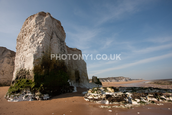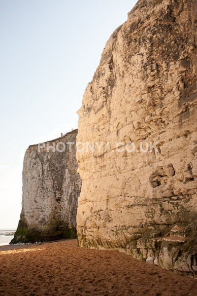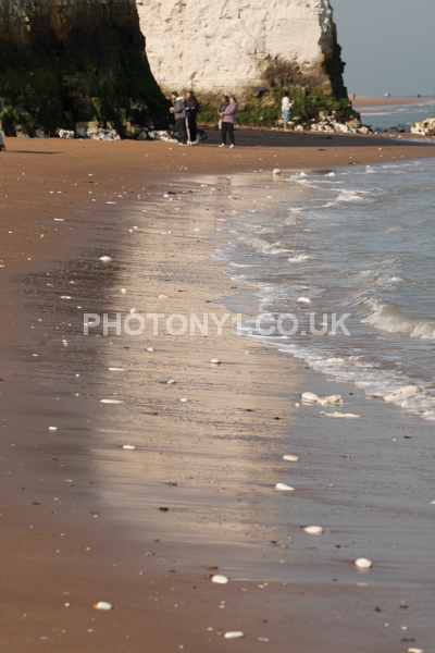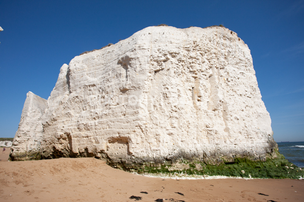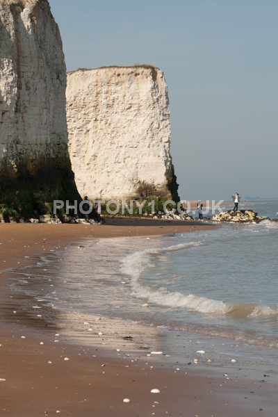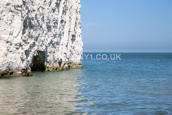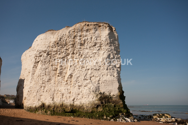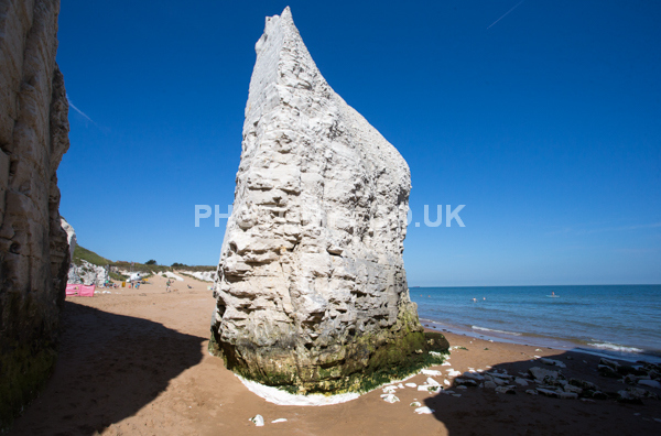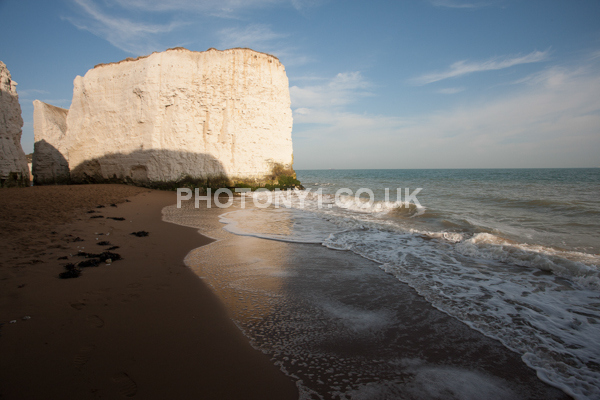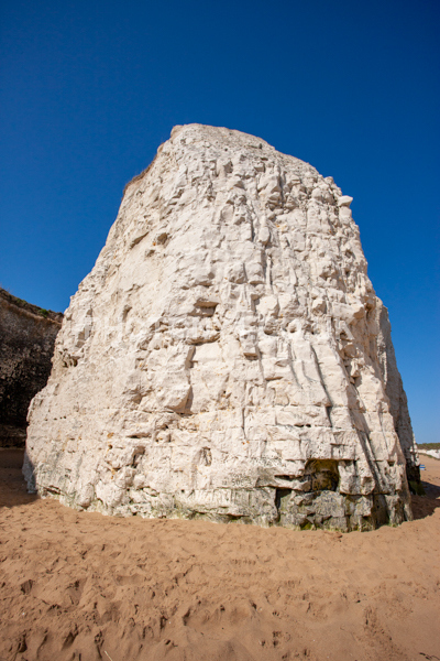 Chalk Cliffs, sandy beach, rocks and sea, with sunshine, shadows and reflections. Neptunes Tower a historic monument.