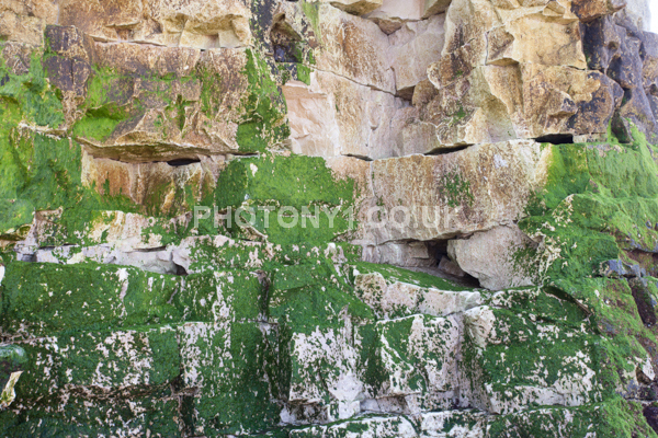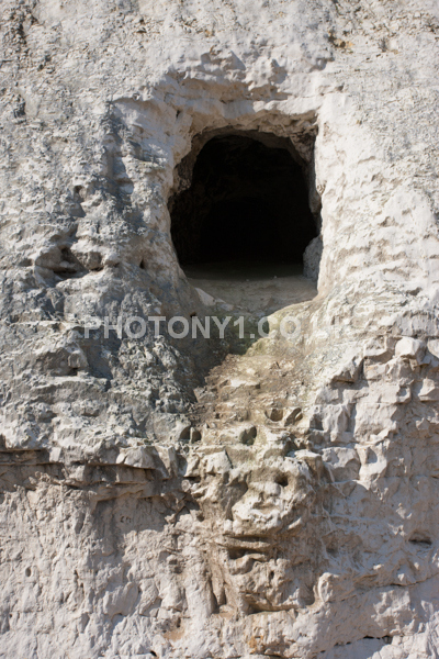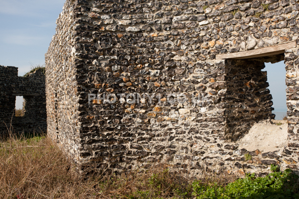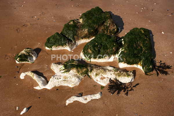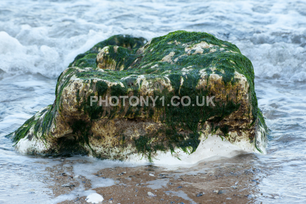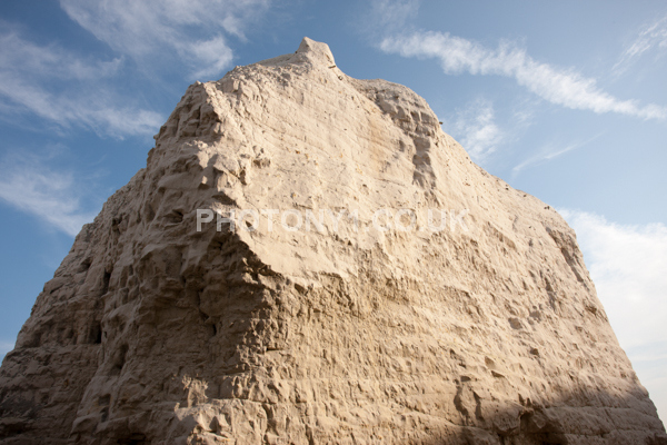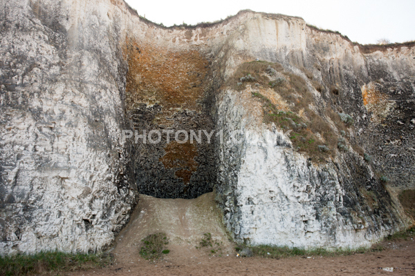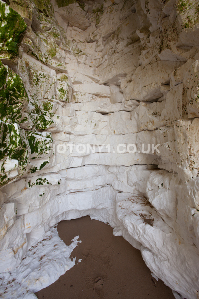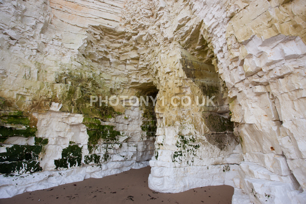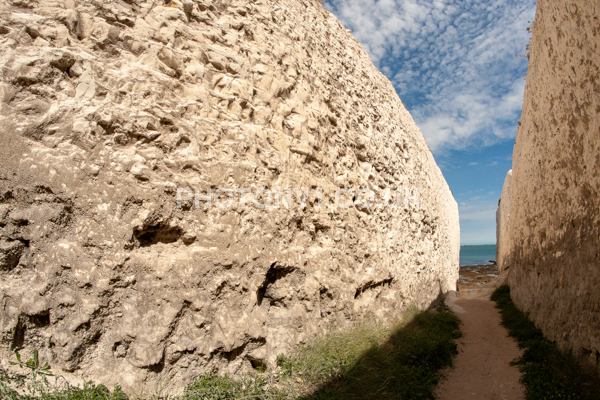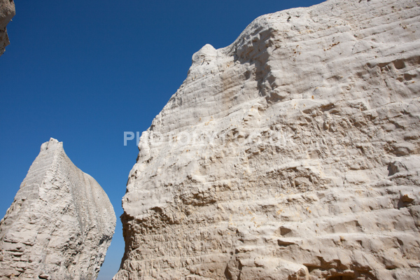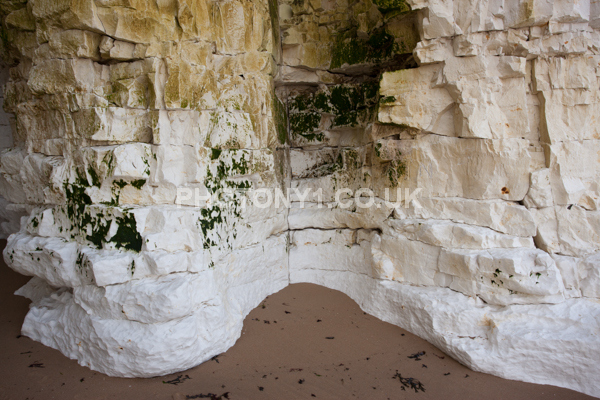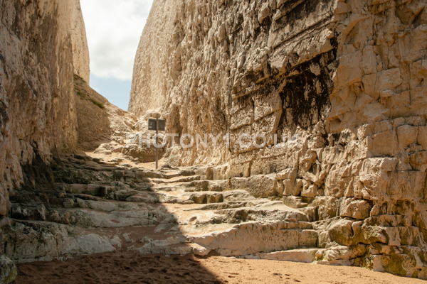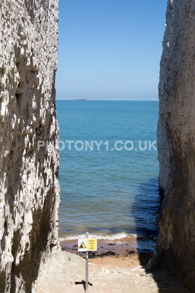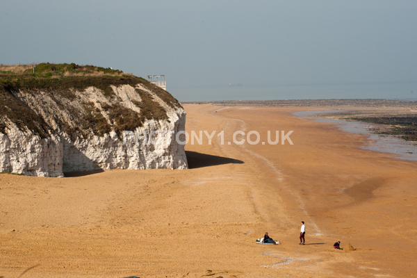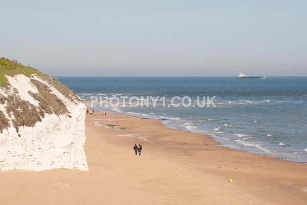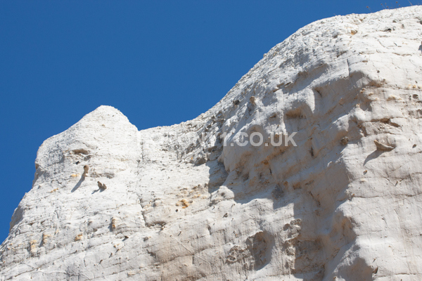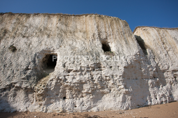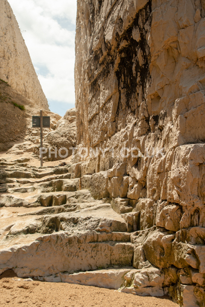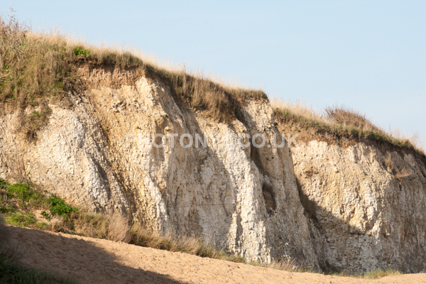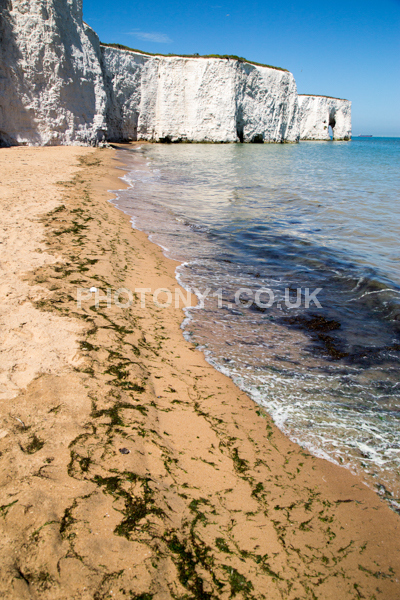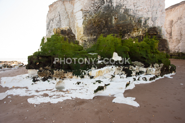 Chalk Cliffs, sandy beach, rocks and sea, with sunshine, shadows and reflections. Neptunes Tower a historic monument.