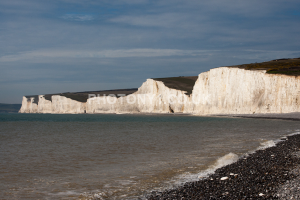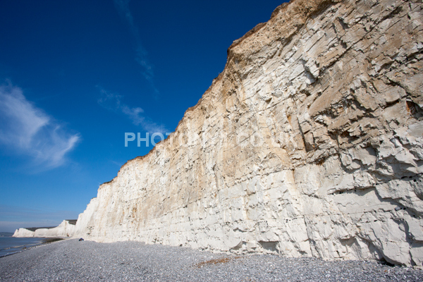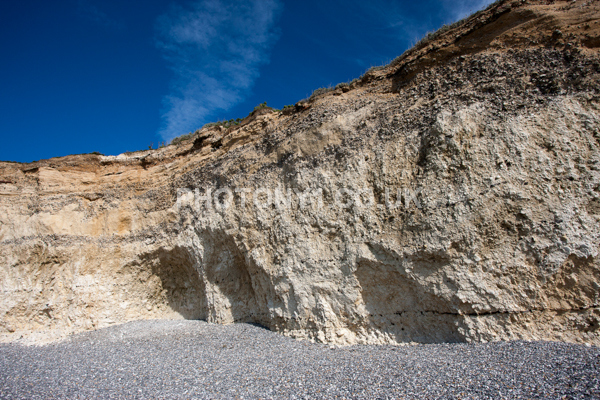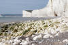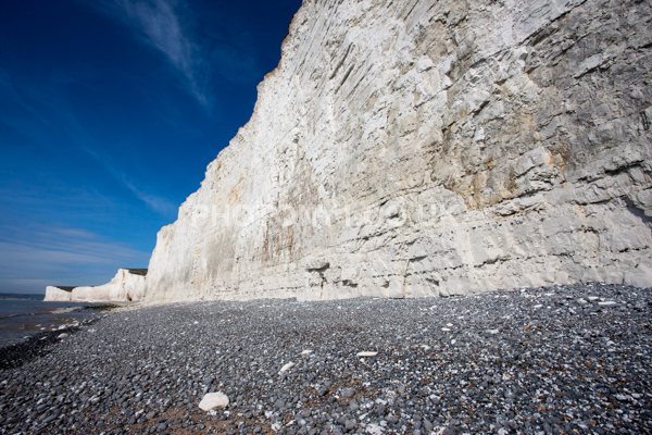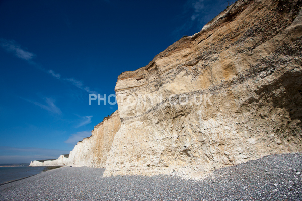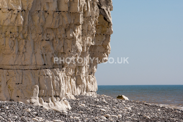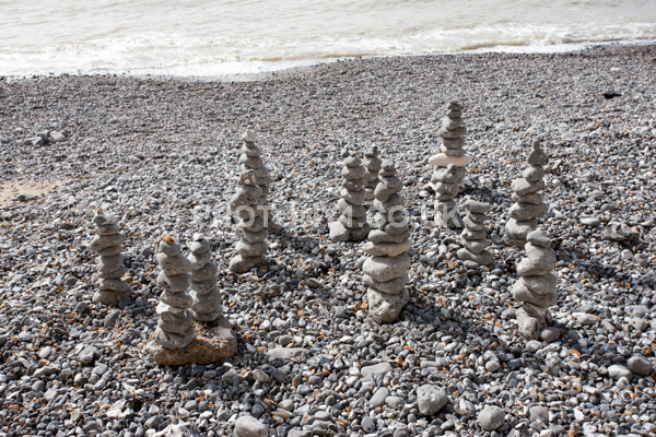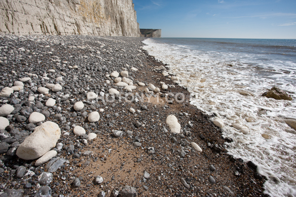 Chalk Cliffs, sandy beach, rocks and sea, with sunshine, shadows and reflections. Pebble piles, art on the beach.
